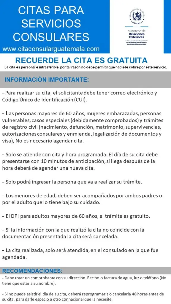 El Ministerio de Relaciones Exteriores del Gobierno de Guatemala recuerda que nadie puede ni debe cobrar por las citas en ningún Consulado ni por supuestamente adelantarlas. Cualquier anomalía debe ser denunciada.