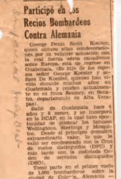Nacido en Guatemala en 1913, George Denis Scott Koester se unió al ejército canadiense en 1940 y fue asignado como navegante en los escuadrones 109 y 105 de la Real Fuerza Aérea Británica, unidades de élite especializadas en misiones secretas con el sistema de precisión Oboe, usado para guiar bombardeos nocturnos.