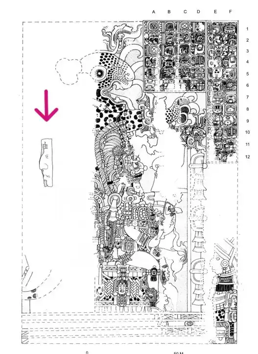 Doyle y Houston colocaron el misterioso rostro, hipotéticamente en una viga, hoy perdida, del dintel 3, del templo I, el cual se encuentra en el Museo Británico.