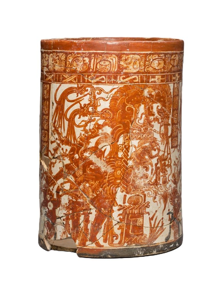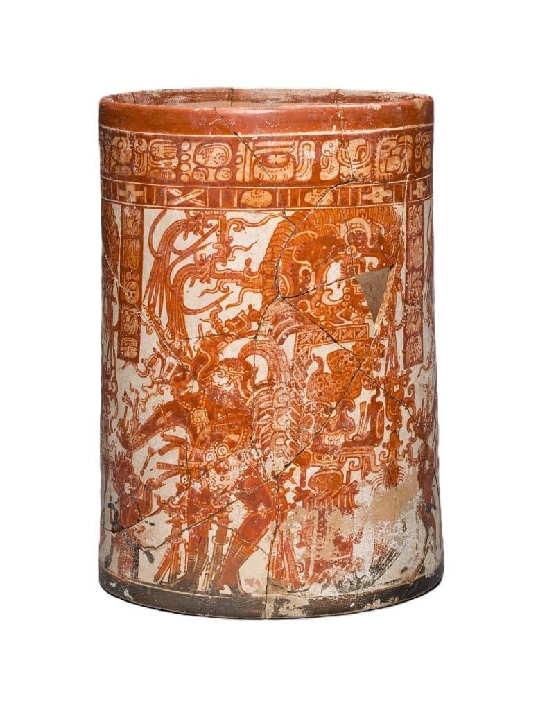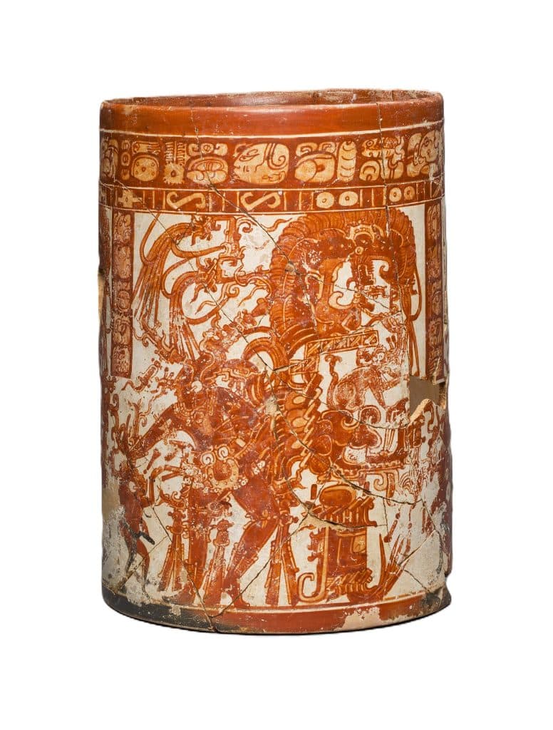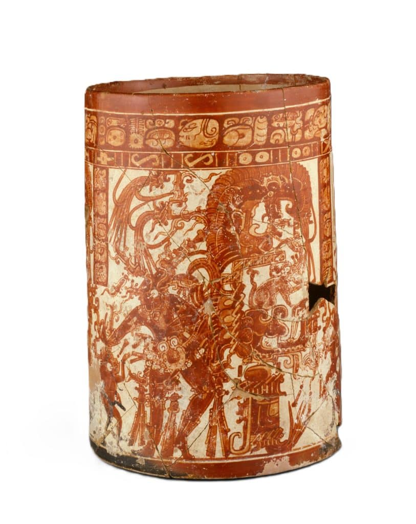 Este vaso, proveniente del sitio Naranjo, en Petén, se encuentra cuidadosamente conservado en el Art Institute of Chicago. “Esta vasija del período Clásico Tardío (600-800) representa a un gobernante maya vestido como el dios del maíz en tres paneles casi idénticos. En su espalda, el gobernante lleva un enorme corsé que contiene plumas brillantes”, señala la ficha de dicha institución.