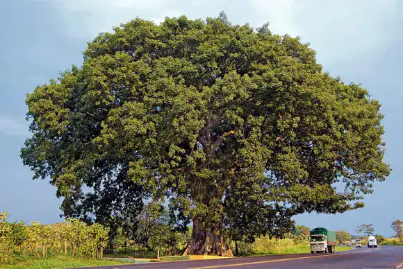 Características: Árbol monumental que puede superar los 60 metros de altura. Su tronco es grueso y con espinas cónicas en la juventud. Las raíces tabulares y la copa amplia lo hacen imponente en el paisaje.