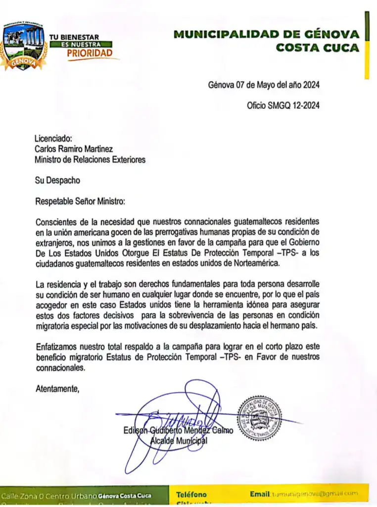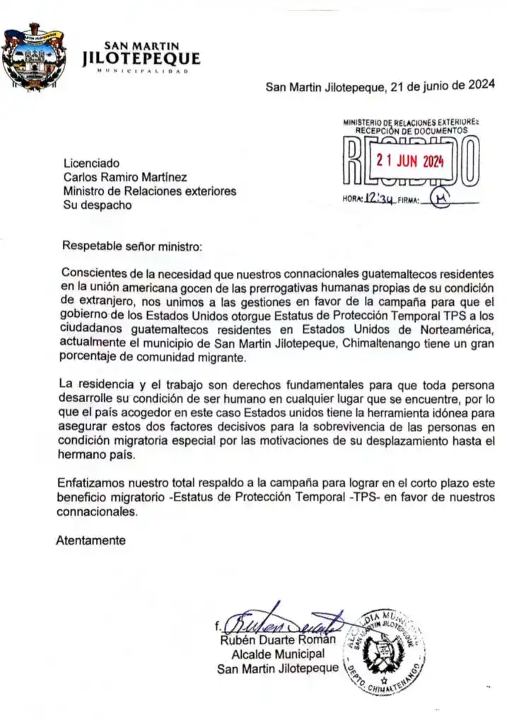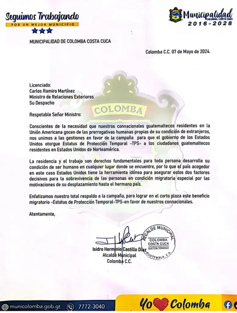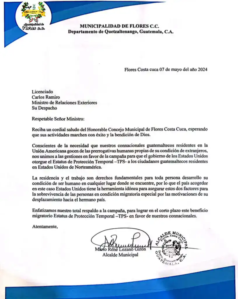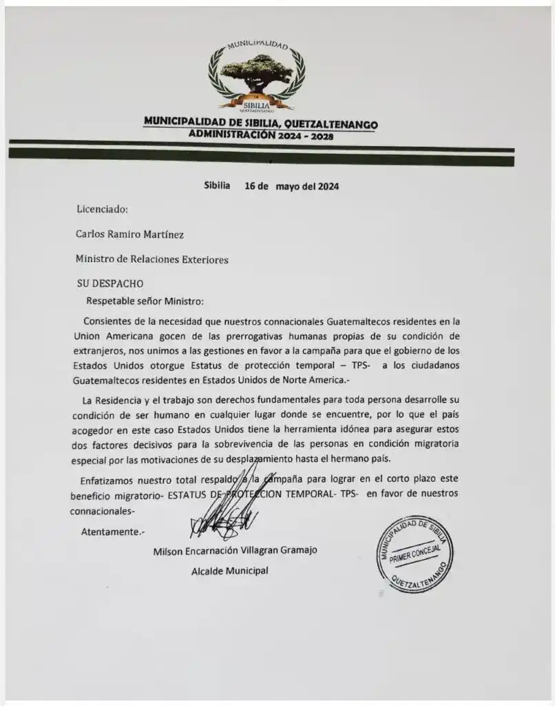 Las cartas de las alcaldías expresan estar conscientes de la necesidad que los connacionales guatemaltecos en la Unión Americana gocen de prerrogativas humanas dignas. Piden el derecho a un trabajo digno, sobre todo porque Estados Unidos posee una herramienta idónea, la declaratoria de TPS.
