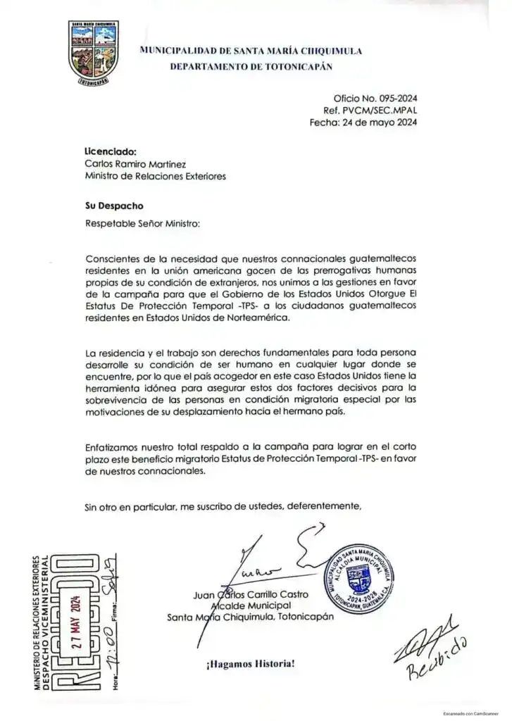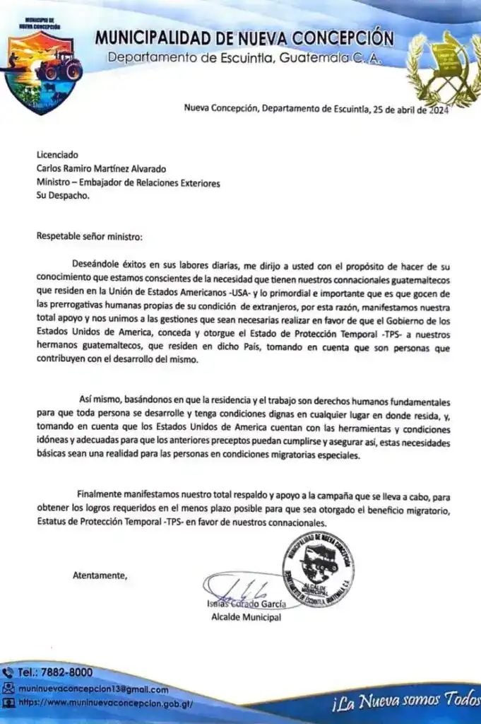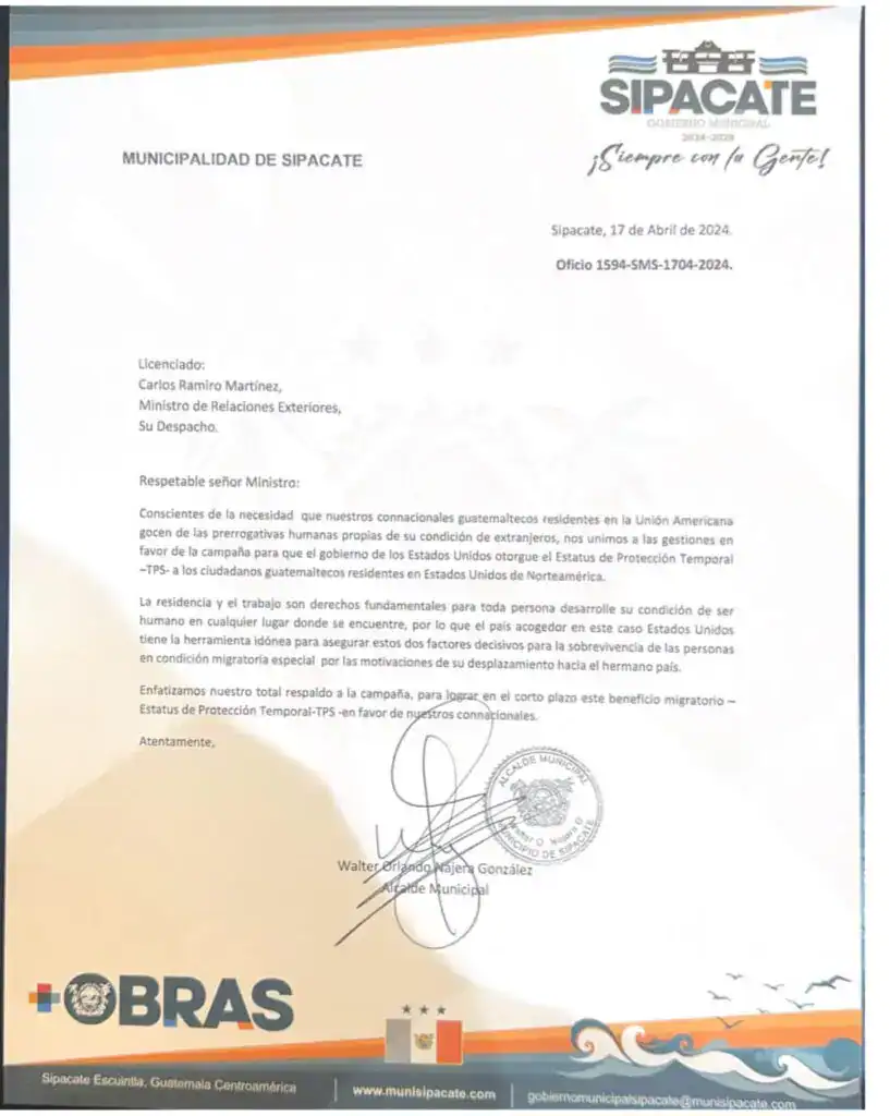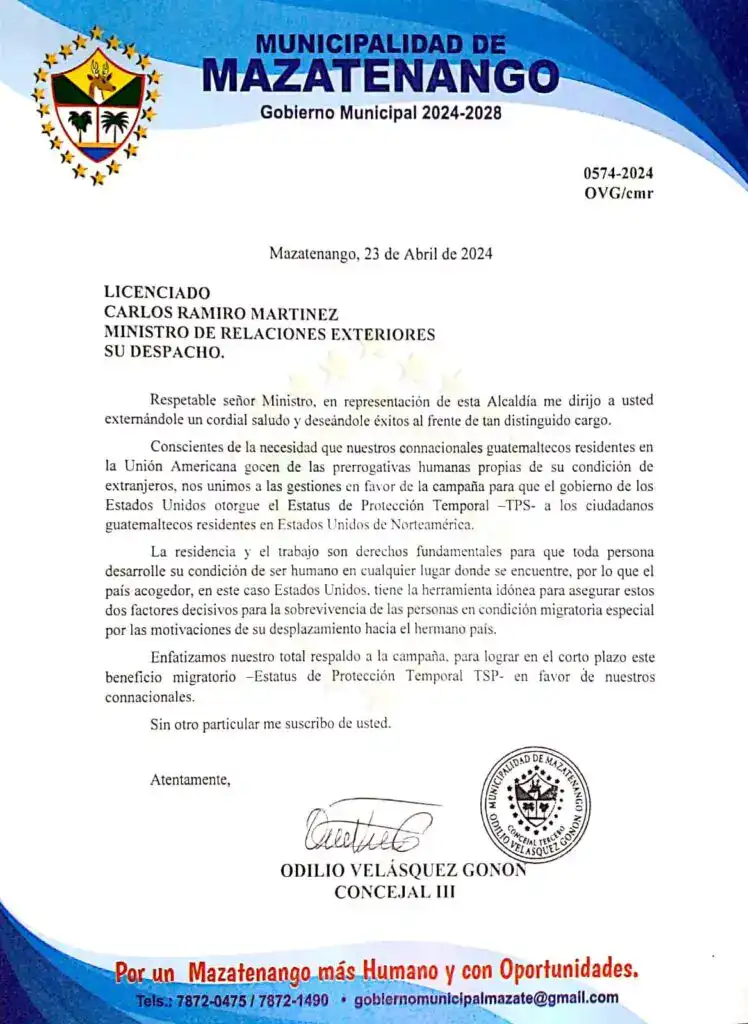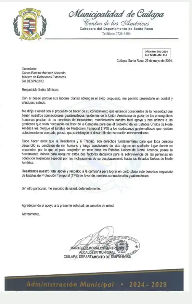 Las cartas de las alcaldías expresan estar conscientes de la necesidad que los connacionales guatemaltecos en la Unión Americana gocen de prerrogativas humanas dignas. Piden el derecho a un trabajo digno, sobre todo porque Estados Unidos posee una herramienta idónea, la declaratoria de TPS.
