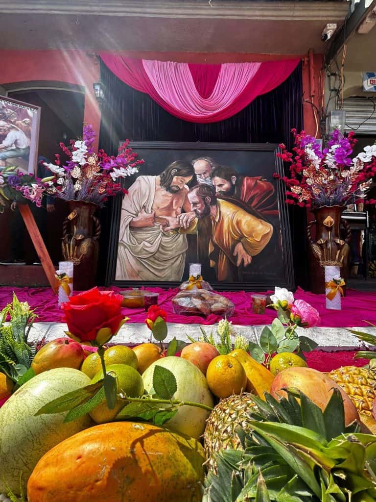 En la fachada principal, un mascarón gigante sostenido por dos manos representa la reconciliación entre los pueblos. También se observan símbolos del “león” de San Marcos y el “gallo” de San Pedro, que evocan los emblemas de ambas comunidades.