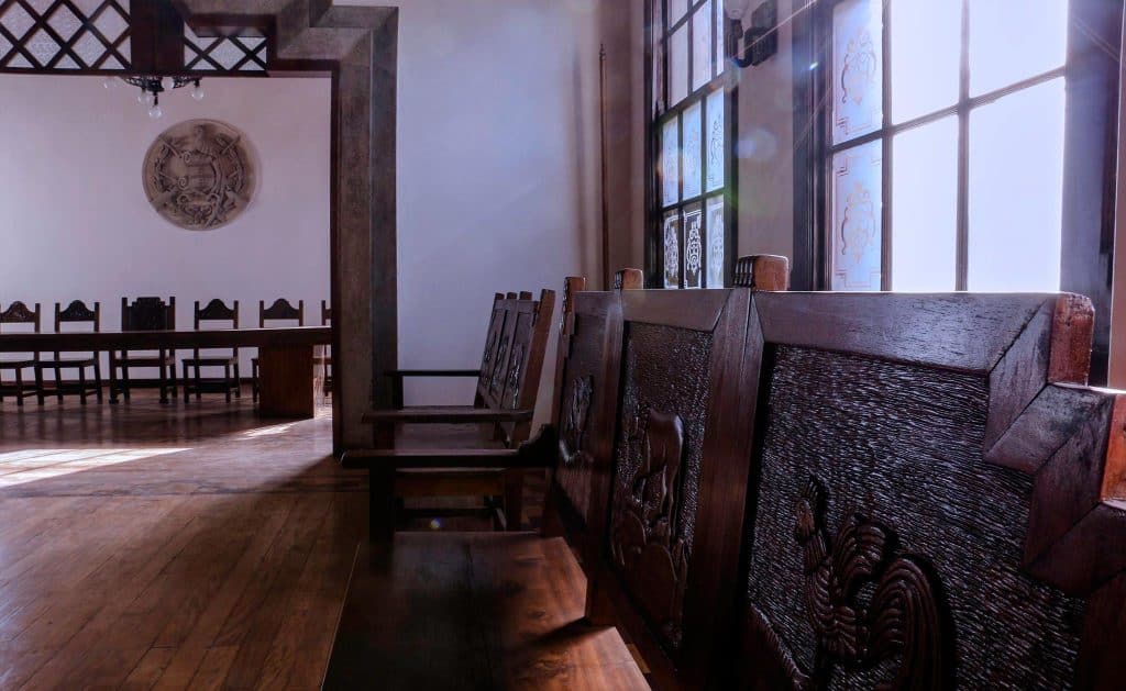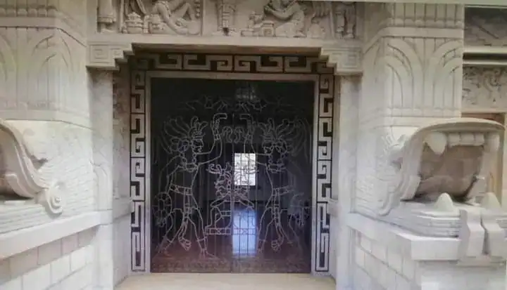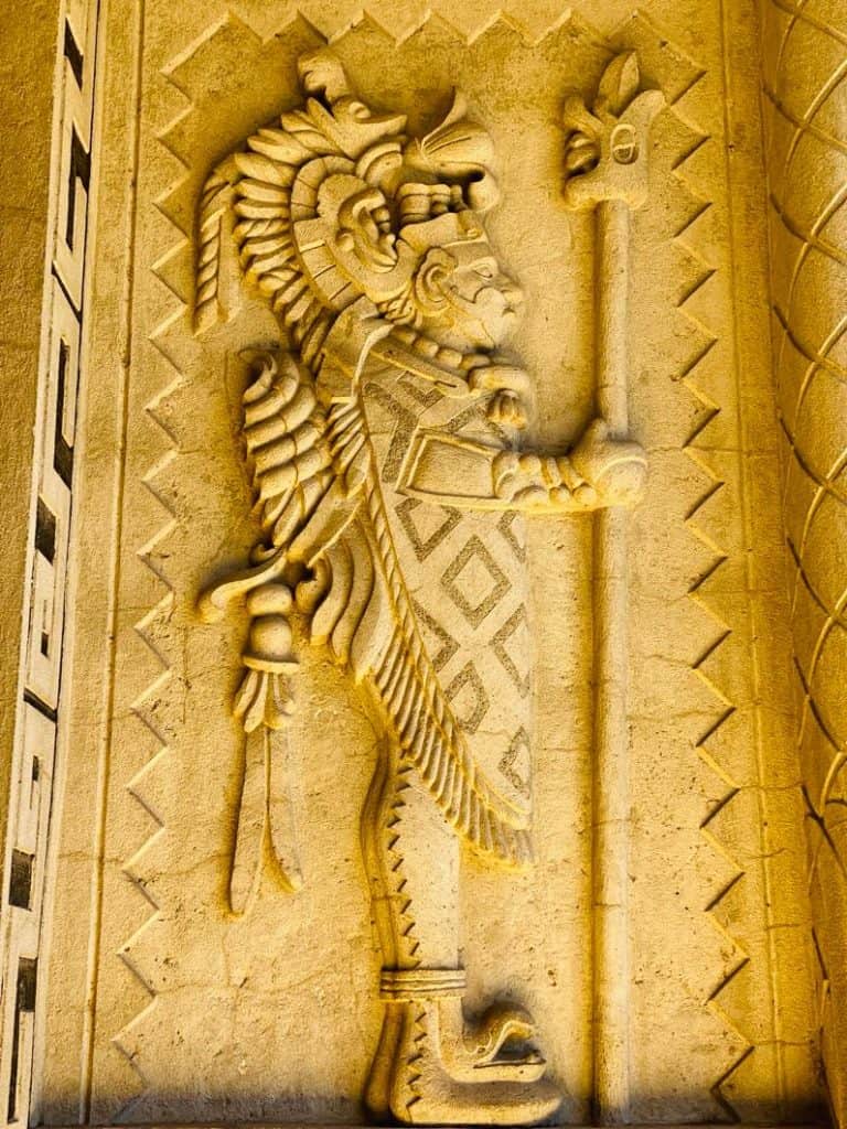 Desde las repisas hasta las lámparas, todo en el palacio está cuidadosamente ornamentado con símbolos mayas. Es un ejemplo excepcional de la técnica de “talla directa” sobre concreto y uno de los pocos edificios públicos en el país con un nivel de detalle artístico tan elevado.