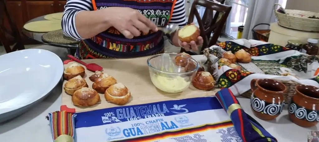 El relleno varía, pero comúnmente incluye carne de cerdo o pollo con un recado ligero a base de tomate, aunque hay versiones más sencillas que solo llevan masa.